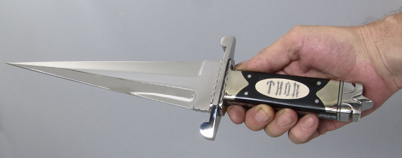 We start with a scale drawing. This will be a 14 1/2" dagger with a 10" blade, stainless steel fittings, nickel silver inlayed bolsters and a ivory inlay in the handle. It will have filework and black micarta handle scales.